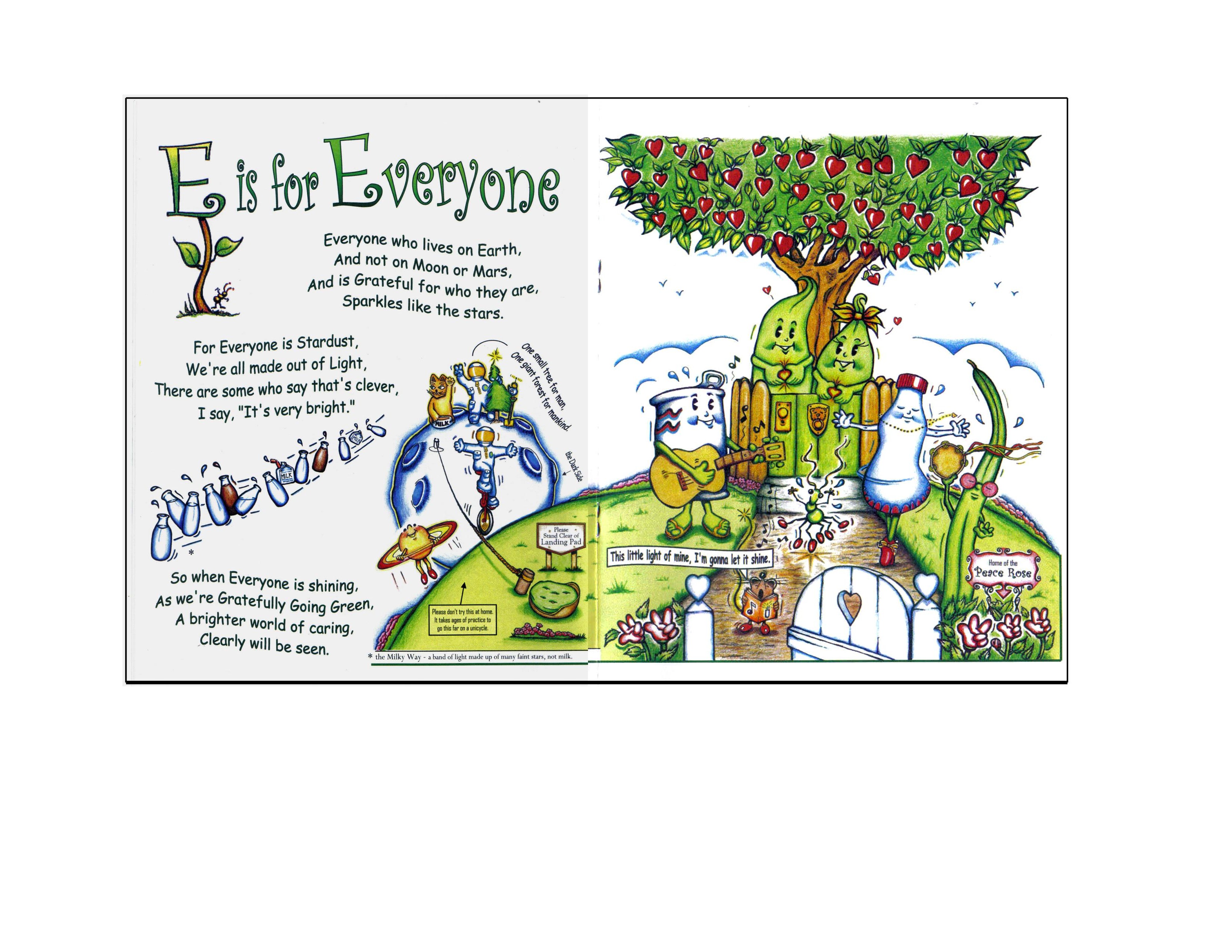 Everyone is happy. Everyone is excited. Because grEen is for Everyone. (Two of the “delicious” pages from Gratefully Going GREEN)    Copyright 2012 David J. Hiebert